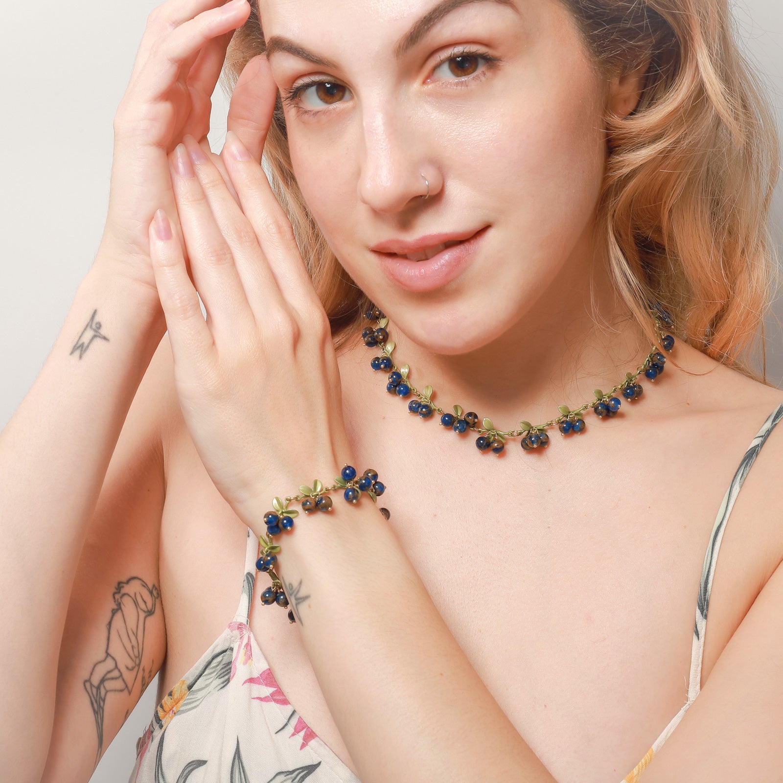 Introducing the Willa - Blueberry Glow Bracelet, a charming piece from our exclusive Orchard Jewelry collection. This beautiful bracelet is designed to celebrate our love for nature, featuring clusters of dark purple ripe berries and vibrant green leaves that evoke the essence of a serene autumn landscape. Its golden chain adds a touch of elegance, making it the perfect accessory for women and children alike.